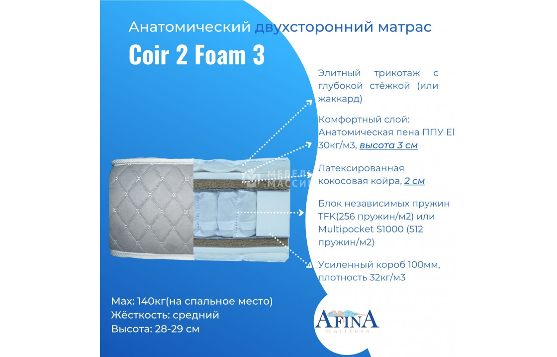двусторонний Coir Ortofoam 2 / Coir 2 Ortofoam 2 от фабрики афина с пружинным блоком tfk-256 (256 пружин на кв. метр) или multi-512 (512 пружин на кв. метр) на выбор. чехол жаккард стёганный 180-220 гр/м2 или элитный трикотаж с объёмной стёжкой 300гр/м2 на выбор. купите по цене производителя в интернет-магазине мебель массив.| Размер | Цена | |