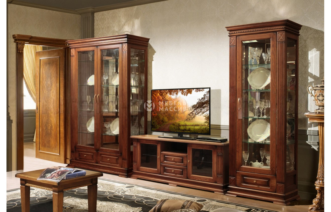 Состав гостиной:   1. Шкаф Флоренция-4 из массива сосны: размер 2050x600x400, 1 шт. 54580 руб. 2. Шкаф двойной Флоренция-2 из массива сосны: размер 2000x1100x450, 1 шт. 99670 руб. 3. Тумба Флоренция-2 из массива сосны: размер 620x1500x400, 1 шт. 48470 руб.