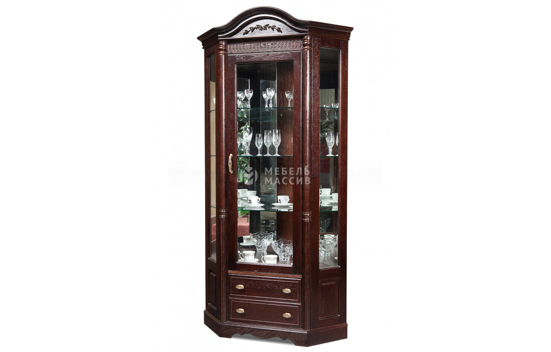 Скошенный сервант Валео - небольшой предмет мебели, сочетающий в себе необычный внешний вид и хорошую функциональность. Дизайн изделия выдержан в классическом стиле. Основным отличительным элементом является застекленная створка, занимающая большую часть фасада. Внутреннее пространство за стеклом отведено под полки, куда можно поместить небольшие растения, элитную посуду и коллекционные предметы. Также модель оборудована четырьмя выдвижными ящиками для скрытного содержания вещей. Внешний вид мебели сразу бросается в глаза. Высокий фронтон украшен цветочной инкрустацией, присутствует и резьба на деревянных элементах. Остаётся только выбрать цвет мебели и подходящую фурнитуру. Доставка по Петрозаводску и Республике Карелия.| Размер | Цена | |